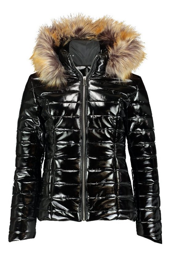 Пуховик з блискучого матеріалу та штучним хутром